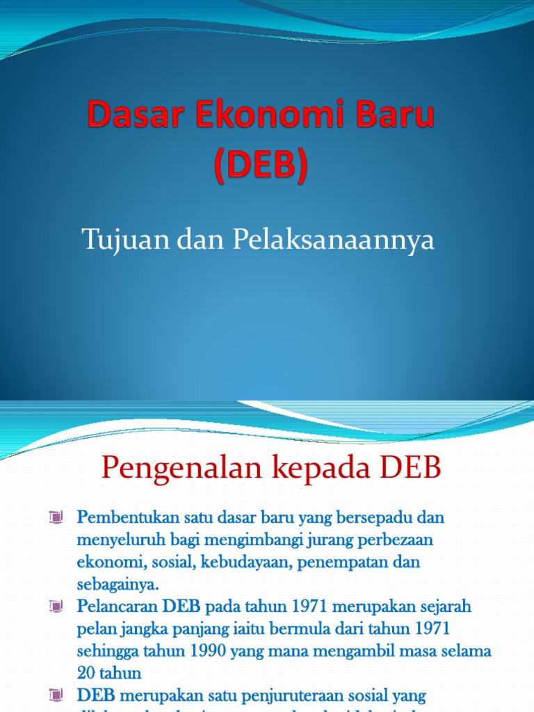 Suatu Penjelasan ringkas berkaitan pelaksanaan DEB oleh pelajar-pelajar tahun 2 UTHM. Dasar Ekonomi Baru 1. 82 - Pelaksanaan Dasar Ekonomi Baru DEB DEB menggunakan beberapa pendekatan untuk melahirkan masyarakat yang bersatu padu melalui ekonomi yang seimbang.